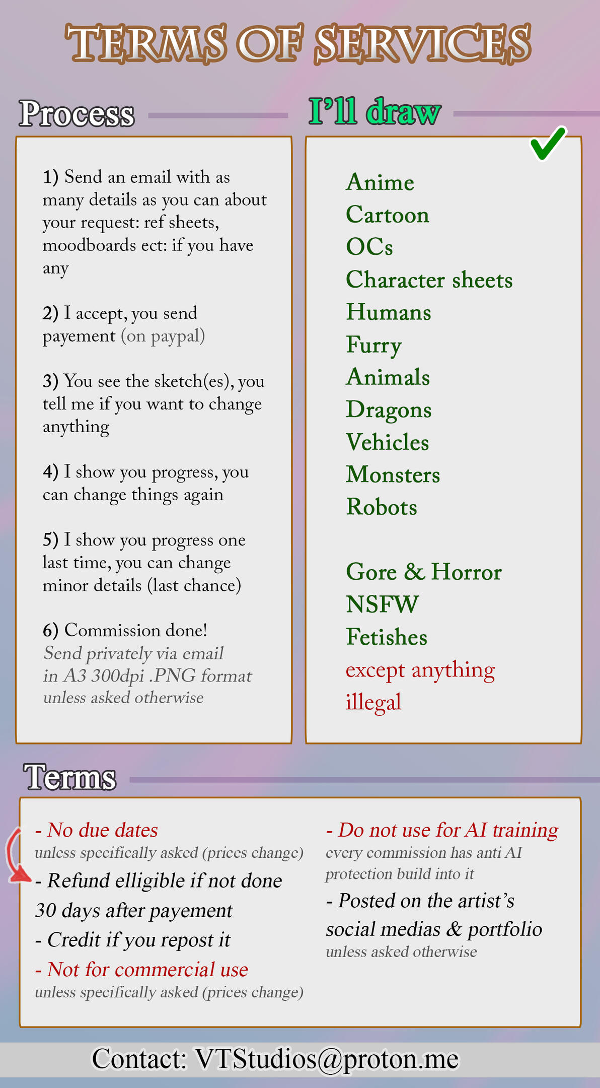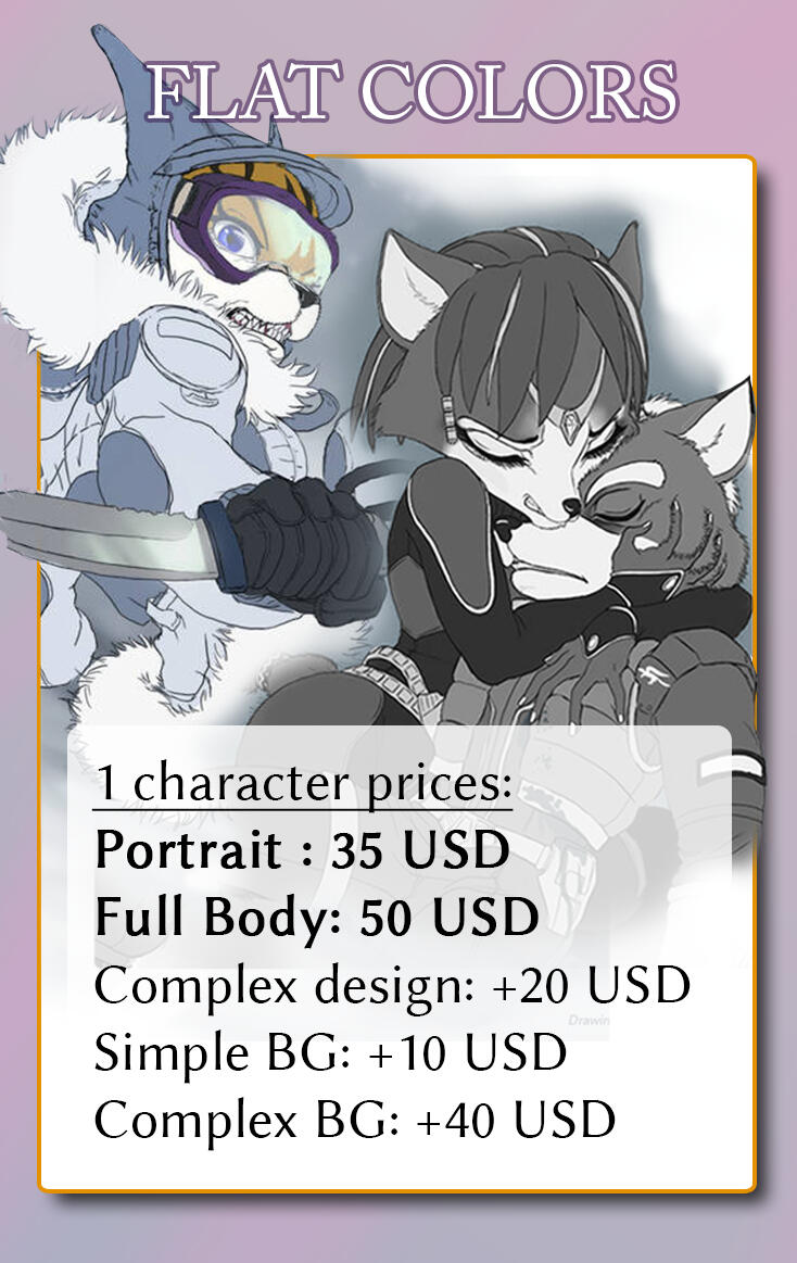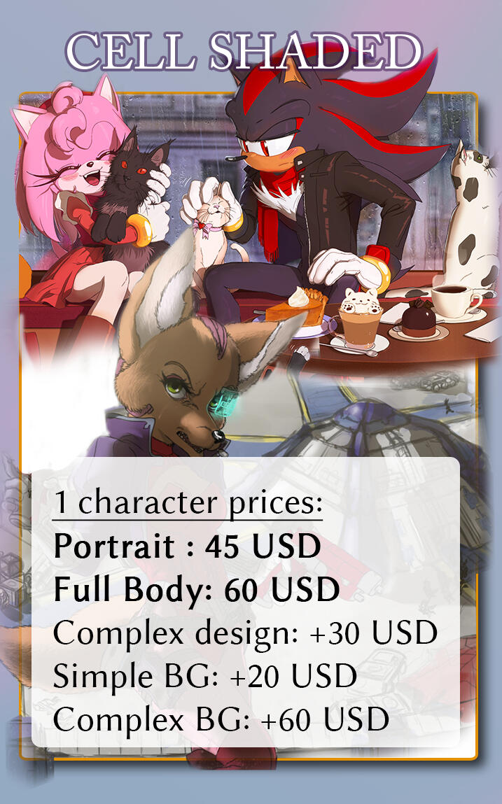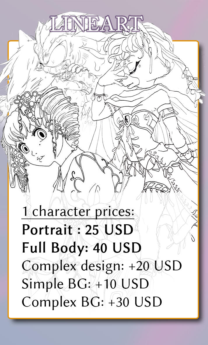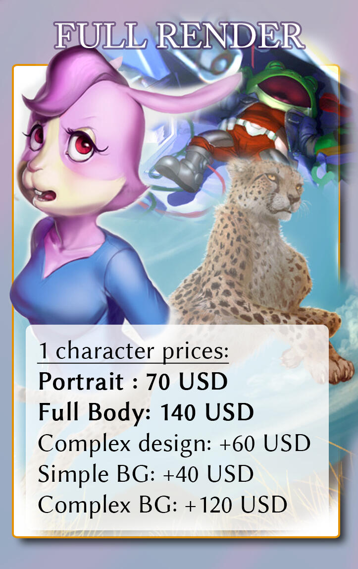 *Complex design means: lots of little details, difficult (dynamic) pose, feathers or added members, hyperealism, ect. All NSFW work is considered "Complex design".